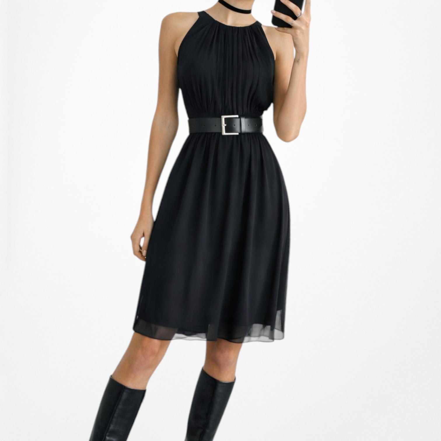 Sleeveless. Pleated details. Knee length. Flared silhouette. Back zip closure. Belt not included