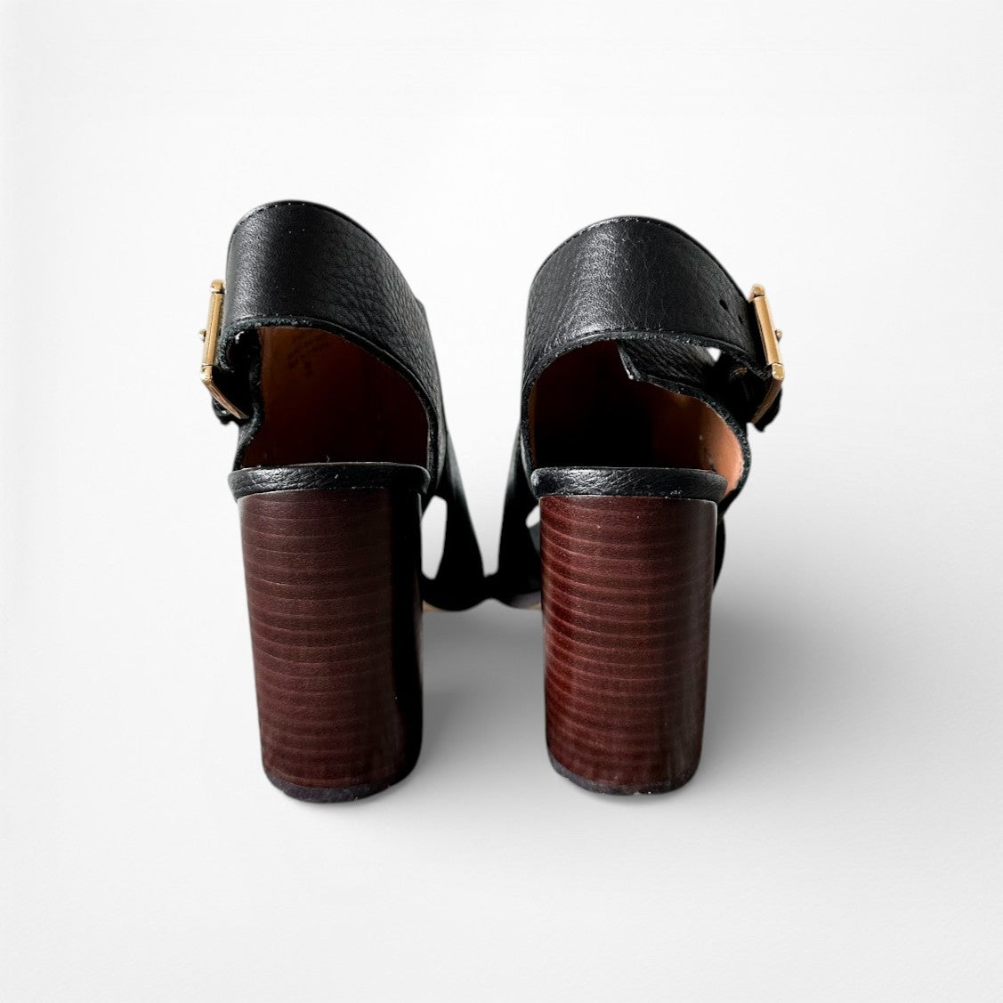 Black leather chunky heel. Features a slingback with buckle closure. Peep toe