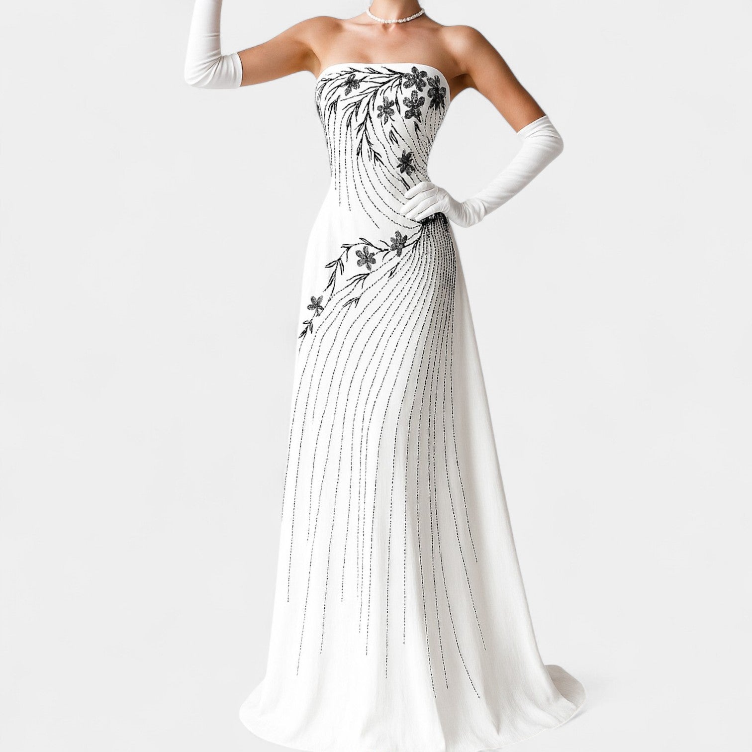 Y2K 2000s coquette fairy white strapless fit flared maxi dress. Black floral beaded throughout over a flowy silk fabric. Zips up in the back. Padded. T