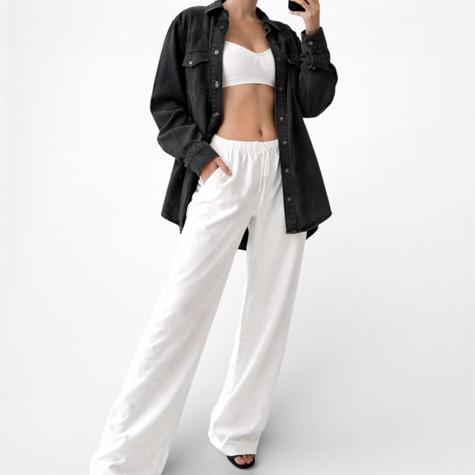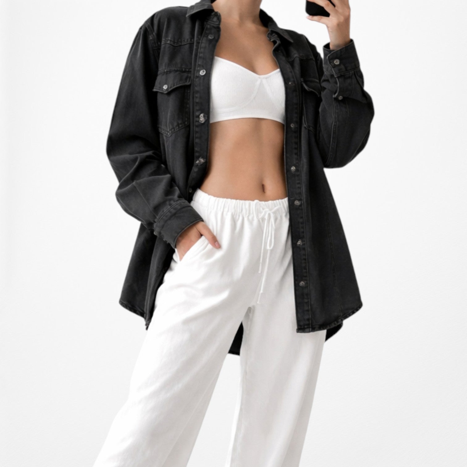 Gray button down shirt. Denim fabric. Two front pockets. Oversized look. Wear it fitted or oversized.