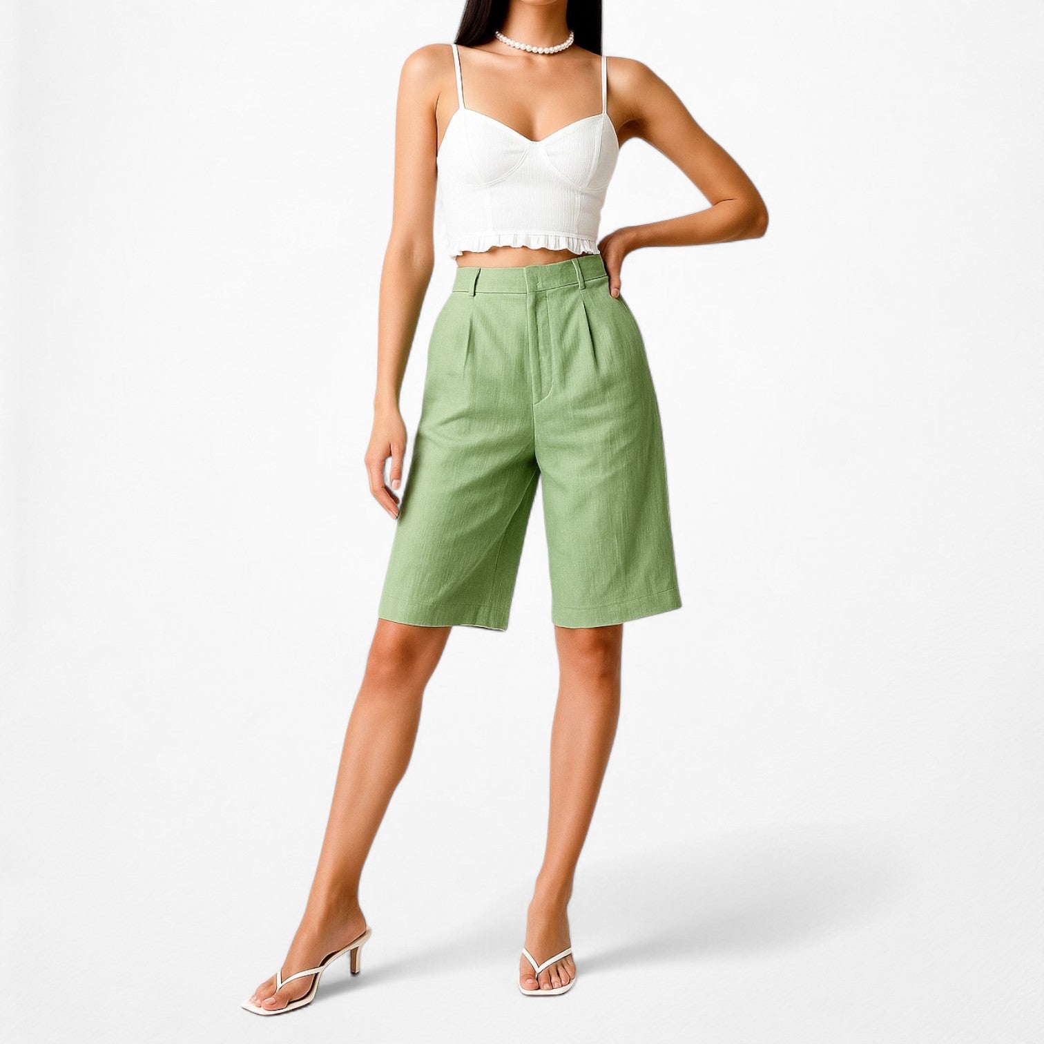 A green high waisted knee length shorts featuring pleated details, two front side pockets, one faux back pockets. Zip and hook closure.